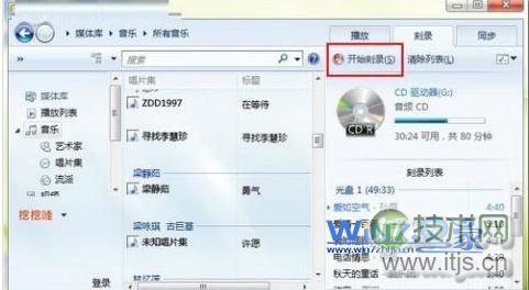 4、假如选择“生成一张数据CD”,单击“下一步”,系统会调用Windows Media Player,此时我们只需要单击“开始刻录”按钮,Windows 7将自动完成刻录工作。