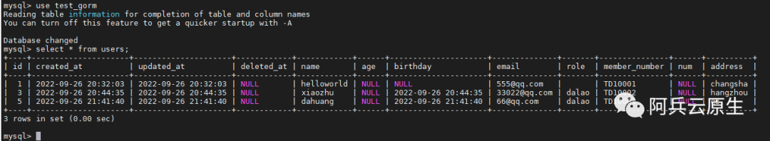 在 GO 中我们访问 mysql 关系型数据库,数据库中提前先创建好了数据库,数据表,以及 3 条记录