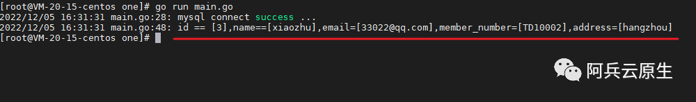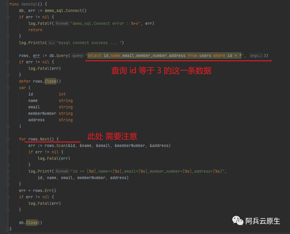 可以发现,本次的查询语句是 select id,name,email,member_number,address from users where id = ? ,我们再一条数据一条数据的读取出来(此处需要注意使用读取 rows.Next() 的时候,需要读取完毕之后,关闭句柄,否则会资源泄漏)