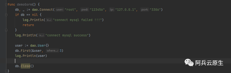 复制func Connect(user, pwd, ip, port string) (*gorm.DB, error) { db, err := gorm.Open("mysql", fmt.Sprintf("%s:%s@tcp(%s:%s)/test_gorm?charset=utf8&parseTime=True&loc=Local", user, pwd, ip, port)) if err != nil { return nil, err } return db, nil }1.2.3.4.5.6.7.上述的查询就会变成这样的