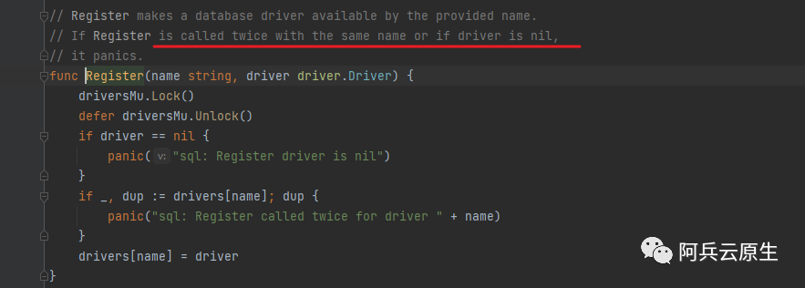 可以看到 mysql 包中的 init 函数,实际上就是做一个注册,用一个有效的名字,对一个这一个数据库引擎