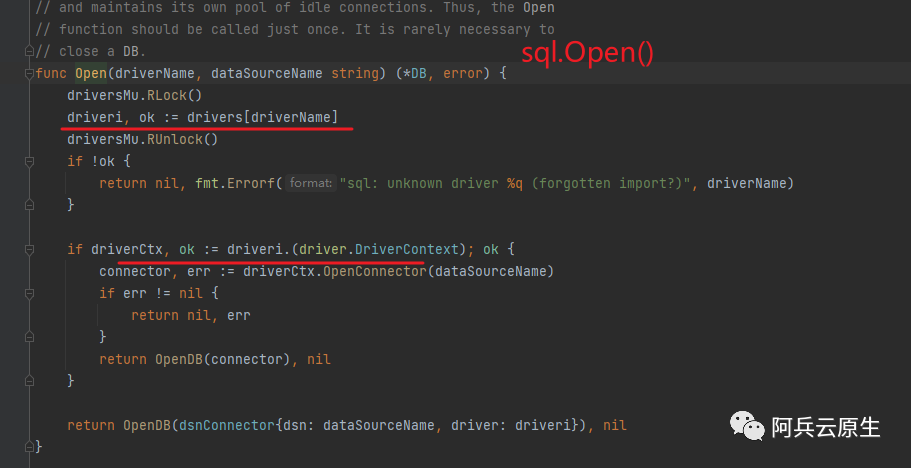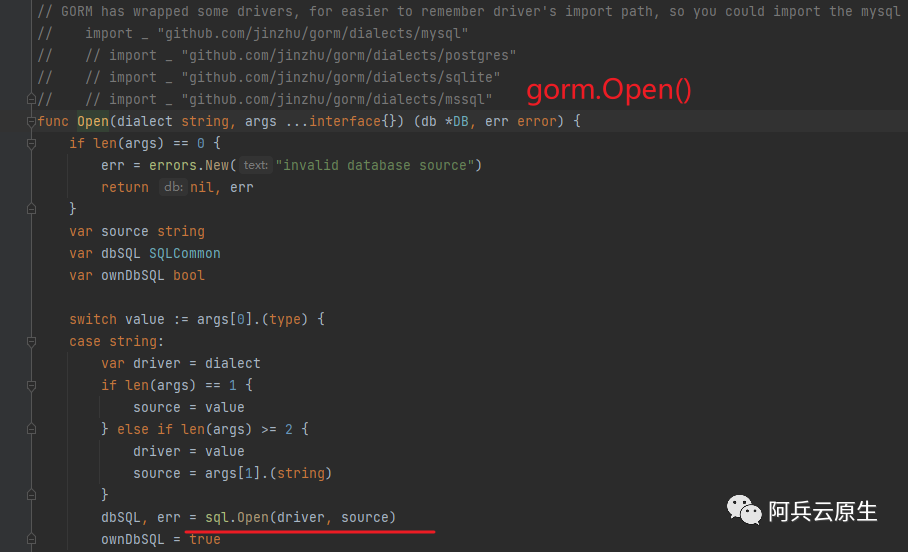 再来查看 gorm.Open() 的实现就一目了然了