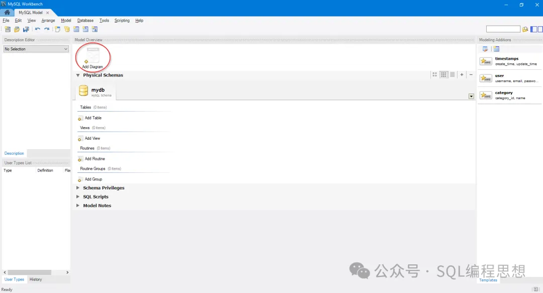 我们以 MySQL Workbench 为例简单介绍如何创建一个用于 MySQL 数据库的物理 ERD。首先点击软件主界面的“File”->“New Model”菜单,然后在打开的模型界面中点击“Add Diagram”按钮,新建一个 ERD 模型。