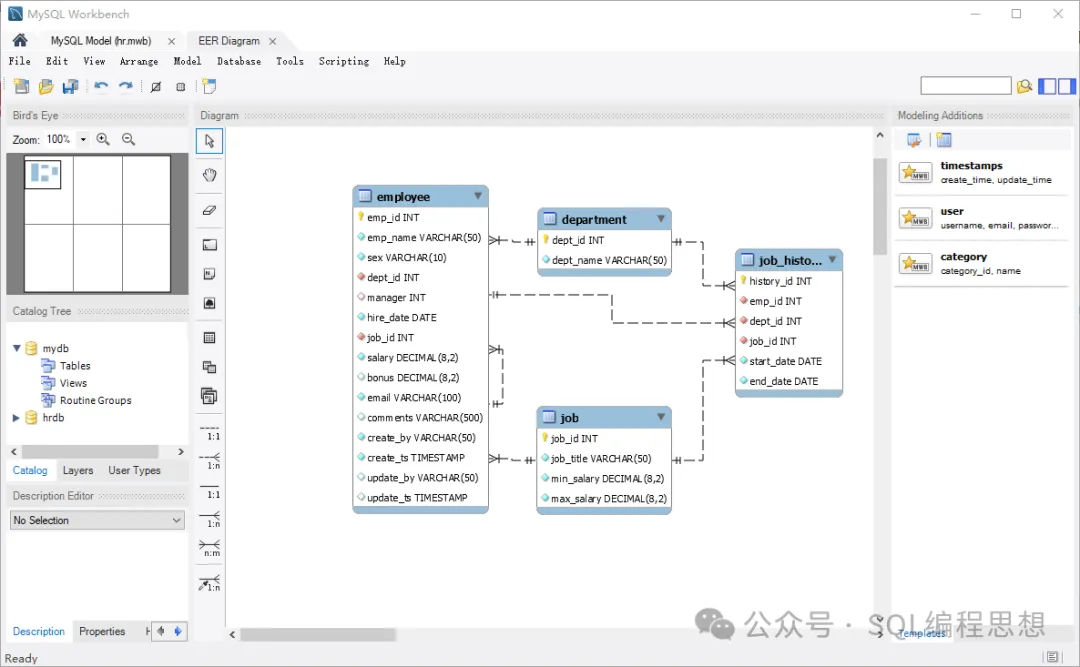接下来我们在 ERD 模型中通过拖曳加编辑的方式创建 department、job、employee 以及 job_history 4 个表,同时通过连线建立它们之间的关系。其中 department 和 employee 之间是一对多的关系,job 和 employee 之间也是一对多的关系,job_history 则和其他 3 个表之间存在外键关联。