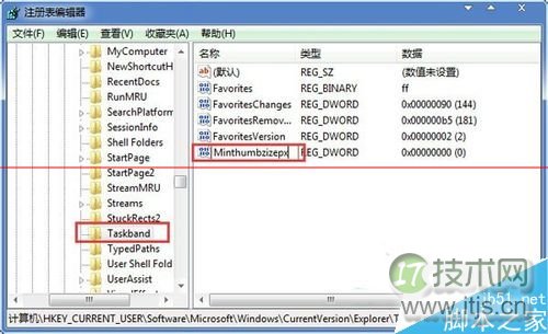 3、在Taskband文件上右键,选择“新建——dword值”,并将这个值重新命名为“Minthumbzizepx ”