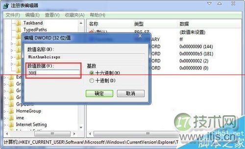 4、云服务器在这个新命名的Minthumbzizepx值上双击,在弹出的设置窗口中将里面的数值数据进行更改,一般改为300即可,假如觉得任务栏的大小还是小的话,还可以将其调大一点。