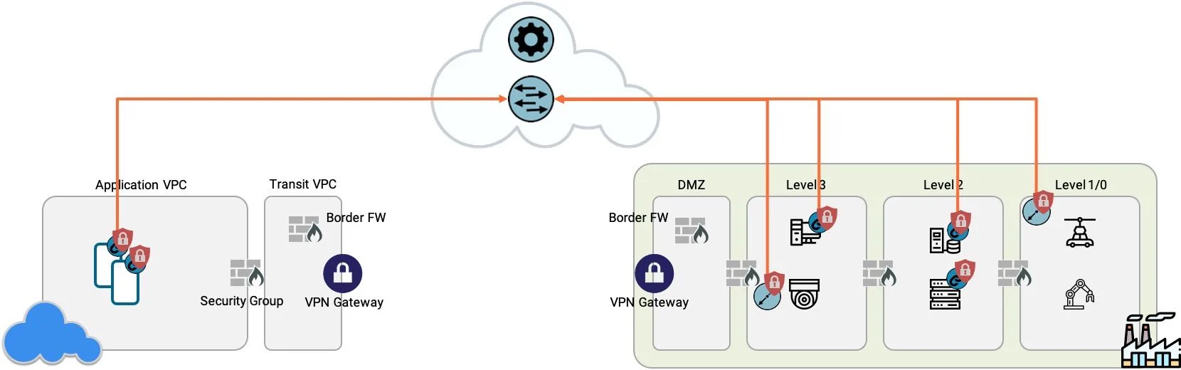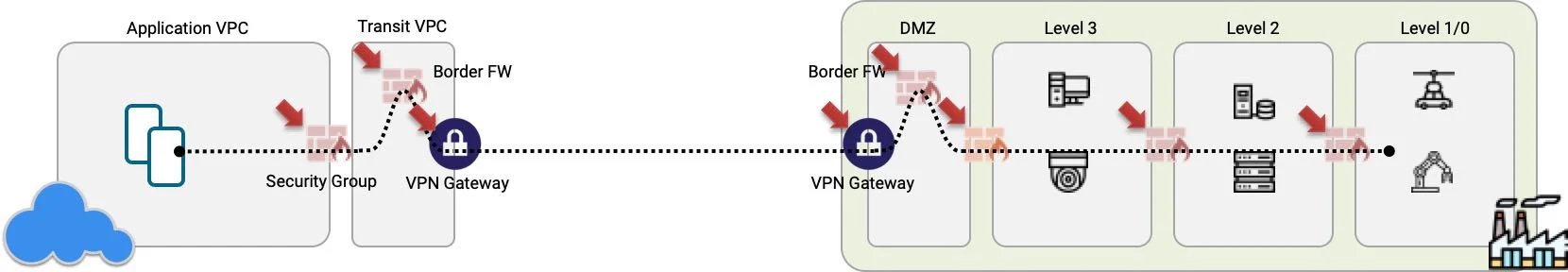 我们以工厂环境中云和资源之间的连接为例。允许云服务器连接到工厂车间机器的策略,由路径上多达 6-12 个不同的路由器、交换机和防火墙控制,而每个路由器、交换机和防火墙可能由不同的团队管理。