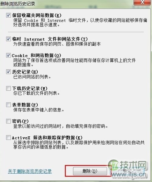 在删除选项中,一般来说,我们按照软件默认选择推荐清理的项目即可,然后点击“删除”,最后IE浏览器会提醒我们已经成功清理了IE缓存文件。