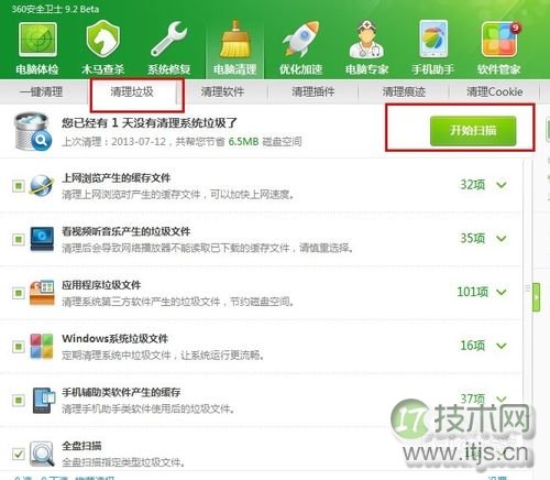 然后我们可以点击“清理垃圾”,由于软件已经为我们设置了推荐清理的选项,我们也可以清楚的看到,关于系统以及浏览器和各种常用的应用软件的缓存文件的清理选项已经进入了清理列表,因此,我们点击“开始扫描”即可。