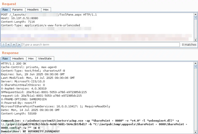 CVE-2025-49706(CVSS 6.3):SharePoint服务器欺骗漏洞CVE-2025-49704(CVSS 8.8):通过ToolPane端点触发的链漏链SharePoint RCE漏洞初步分析认为攻击需要有效凭证,但深入调查显示实际无需任何认证。洞预的报告指出:"对/_layouts/15/ToolPane.aspx的警全POST请求特征非常明显...我们确信攻击全程未使用任何凭证"。