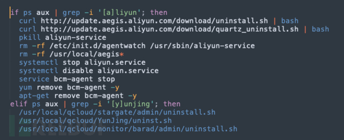 根据已知的矿池、竞争的加密组等的名称来杀死进程。杀死 crond、sshd 和 syslog 等守护进程。删除已知的危害指标(IOC)文件路径。关闭与已知属于竞争性加密集团的 C2 的网络连接。停用阿里云的监控服务,保护实例不受风险活动的影响。
