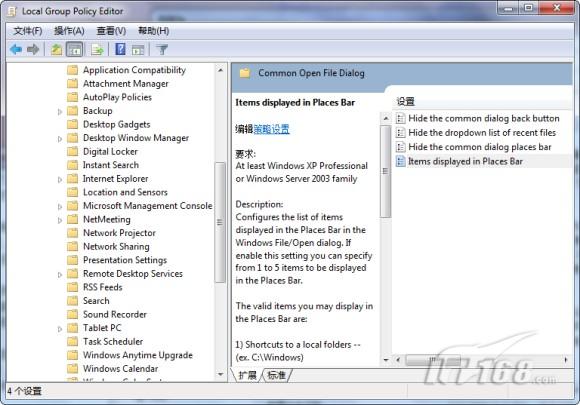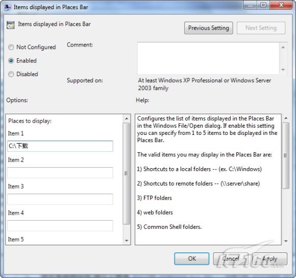 第二种方法,还可以使用系统的组策略编辑器来添加更多位置,点击开始按钮后输入“gpedit.msc”后按下回车(如图7),依次进入到“用户配置——管理模板——Windows Components——Windows Explorer——Common Open File Dialog”,在右侧选择“Items Displayed in Places Bar”后双击,这样就进入到了配置界面。选中“Enable”后就可以在下方添加5个任意的常用位置了(如图8)。