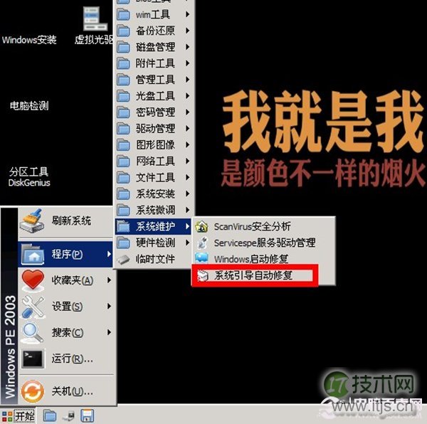 在进入PE之后,我们选择开始菜单---系统维护---系统引导自动修复,根据软件引导修复系统启动项,修复成功后,重启计算机。