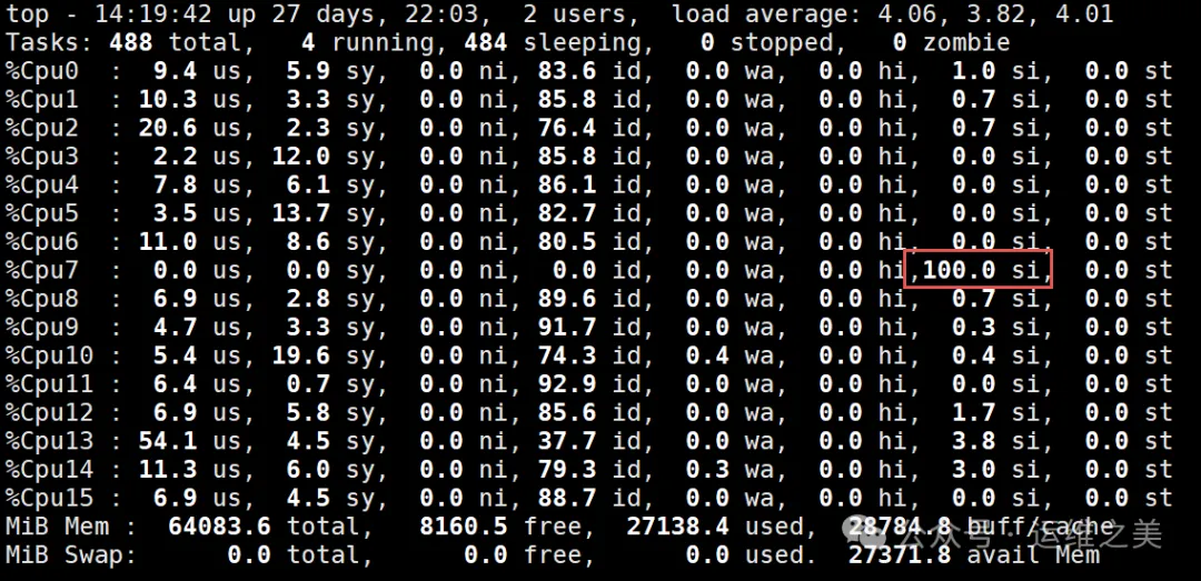 复制[root@localhost ~]# mpstat -P ALL 1 ...... 12时04分31秒 CPU %usr %nice %sys %iowait %irq %soft %steal %guest %gnice %idle 12时04分32秒 all 55.94 0.00 17.79 0.00 0.00 22.54 0.00 0.00 0.00 3.73 12时04分32秒 0 46.67 0.00 33.33 0.00 0.00 0.00 0.00 0.00 0.00 20.00 12时04分32秒 1 68.04 0.00 24.74 0.00 0.00 7.22 0.00 0.00 0.00 0.00 12时04分32秒 2 65.66 0.00 19.19 0.00 0.00 5.05 0.00 0.00 0.00 10.10 12时04分32秒 3 85.86 0.00 12.12 0.00 0.00 1.01 0.00 0.00 0.00 1.01 12时04分32秒 4 18.00 0.00 3.00 0.00 0.00 79.00 0.00 0.00 0.00 0.00 12时04分32秒 5 73.74 0.00 25.25 0.00 0.00 0.00 0.00 0.00 0.00 1.01 12时04分32秒 6 74.49 0.00 19.39 0.00 0.00 6.12 0.00 0.00 0.00 0.00 12时04分32秒 7 64.89 0.00 26.60 0.00 0.00 2.13 0.00 0.00 0.00 6.38 12时04分32秒 8 50.51 0.00 37.37 0.00 0.00 7.07 0.00 0.00 0.00 5.05 12时04分32秒 9 87.76 0.00 12.24 0.00 0.00 0.00 0.00 0.00 0.00 0.00 12时04分32秒 10 9.09 0.00 7.07 0.00 0.00 82.83 0.00 0.00 0.00 1.01 12时04分32秒 11 15.46 0.00 6.19 0.00 0.00 77.32 0.00 0.00 0.00 1.03 12时04分32秒 12 73.91 0.00 20.65 0.00 0.00 0.00 0.00 0.00 0.00 5.43 12时04分32秒 13 82.47 0.00 16.49 0.00 0.00 1.03 0.00 0.00 0.00 0.00 12时04分32秒 14 75.51 0.00 19.39 0.00 0.00 1.02 0.00 0.00 0.00 4.08 12时04分32秒 15 5.94 0.00 3.96 0.00 0.00 84.16 0.00 0.00 0.00 5.941.2.3.4.5.6.7.8.9.10.11.12.13.14.15.16.17.18.19.20. %soft 分布在多个核上网络中断处理负载均衡,单核压力显著降低