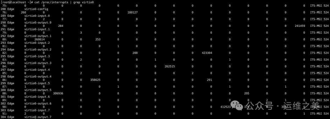 复制[root@localhost ~]# ethtool -i enp1s0 driver: virtio_net #检查驱动类型 version: 1.0.0 firmware-version: expansion-rom-version: bus-info: 0000:01:00.0 supports-statistics: yes supports-test: no supports-eeprom-access: no supports-register-dump: no supports-priv-flags: no [root@localhost ~]# cat /proc/interrupts |grep -i virtio 288 Edge virtio0-config 69: 0 0 0 0 0 0 0 23 0 0 0 3367977005 0 0 0 0 ITS-MSI 524289 Edge virtio0-input.0 70: 0 0 0 0 0 0 0 0 1 185898 0 0 0 0 0 0 ITS-MSI 5241.2.3.4.5.6.7.8.9.10.11.12.13.14.15.16.三、多队列压测
