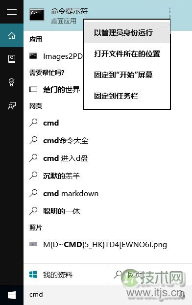 ①在Cortana搜索栏输入CMD,然后在第一个结果点击右键,选择“以管理员身份运行”